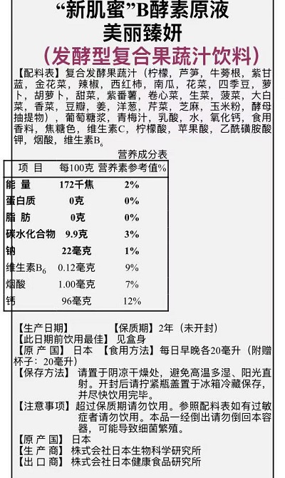 我司與株式合社日本生物科學(xué)研究所合作,進(jìn)口它們研發(fā)生產(chǎn)的“新肌蜜”B酵素原液(美麗臻妍),又一個(gè)有利健康的保健品!開(kāi)始投放中國(guó)市場(chǎng)。